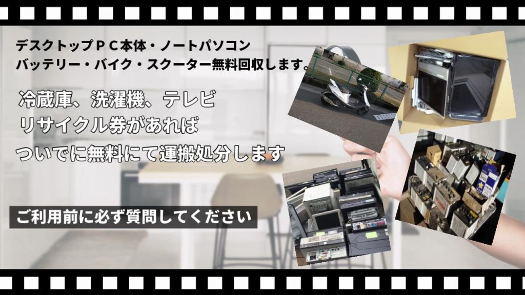 エアコン、クーラーの無料回収があれば、ノートPC、デスクトップPC本体、小型家電、バッテリー、バイク、給湯器なども無料で引き取ります。