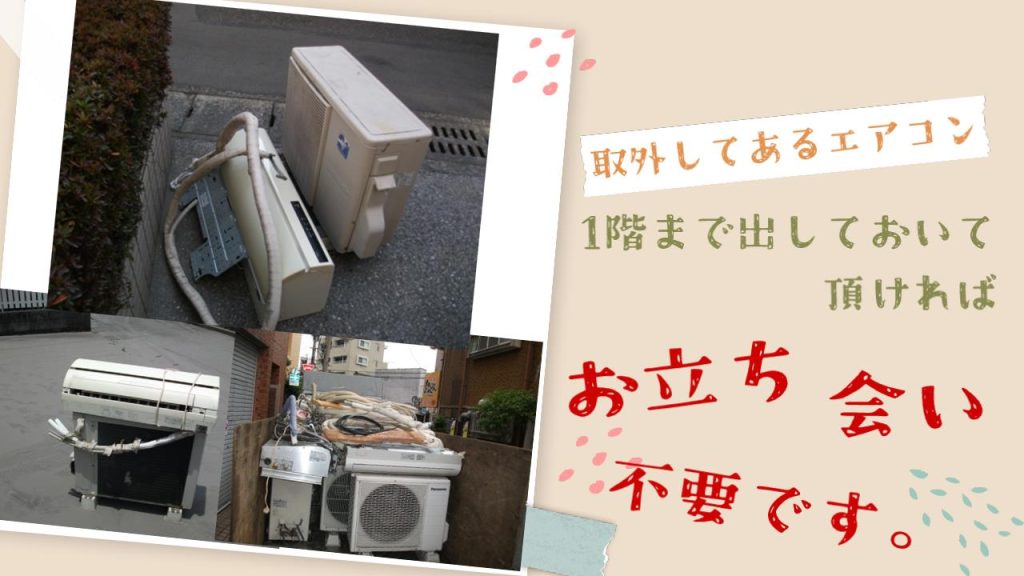 取り外してあるエアコンの回収は1円も頂きません。お忙しい方は一階まで出しておいて頂ければお立ち会いもご不要です。※ご指定の日時にお伺いしますので何日も何時間も置いたままにはなりません。出来るだけ当日にお出しください。もちろん出さなくてもご自宅まで取りにお伺いも致します。